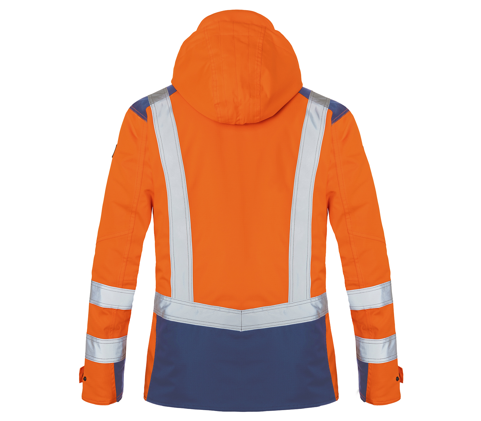 Reflective elements: Reflective stripes positioned according to the body language concept, stripe around the body (5cm wide), 2 stripes around the sleeves (5cm wide), additional stripes over the shoulder and on the upper back (5cm wide)
